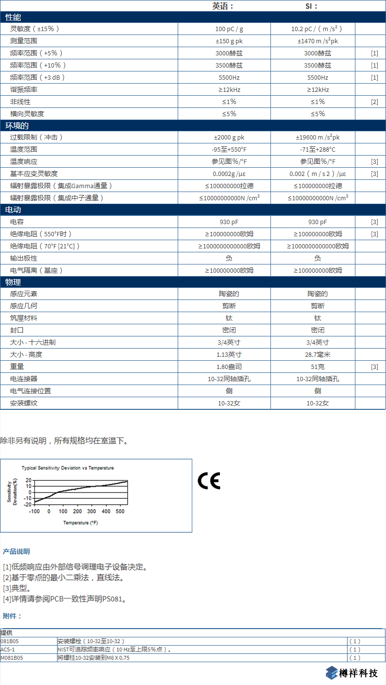 電荷輸出加速度,100 pC / g,150g,3kHz,10-32側(cè)連接,高溫。+550 F(+288 C),Rad Hard靈敏度:(±15%)100 pC / g(10.2 pC /(m /s2))測量范圍:±150 g pk(±1470 m /s2pk)頻率范圍:(+ 5%)3000 Hz重量:1.80盎司(51克)