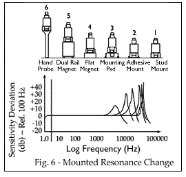 圖中顯示了六種可能的安裝技術(shù)及其對典型壓電加速度計響應(yīng)的影響。(請注意,并非所有安裝方法都適用于您的特定傳感器。)